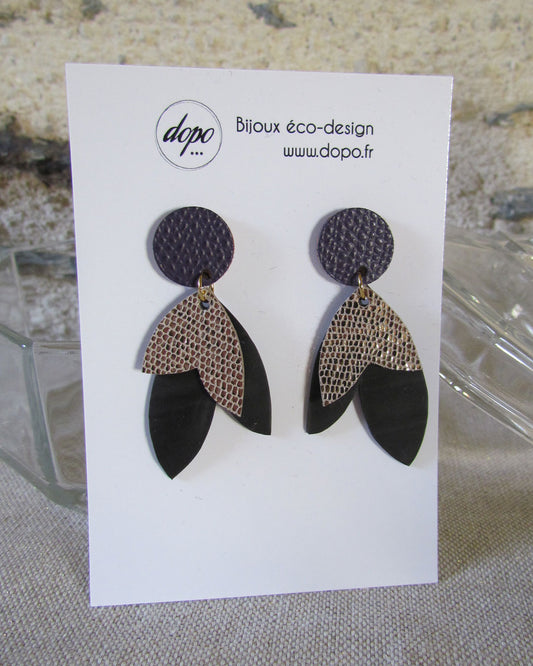Boucles d'oreille : les Pétales de chambre à air et cuirs violet et or