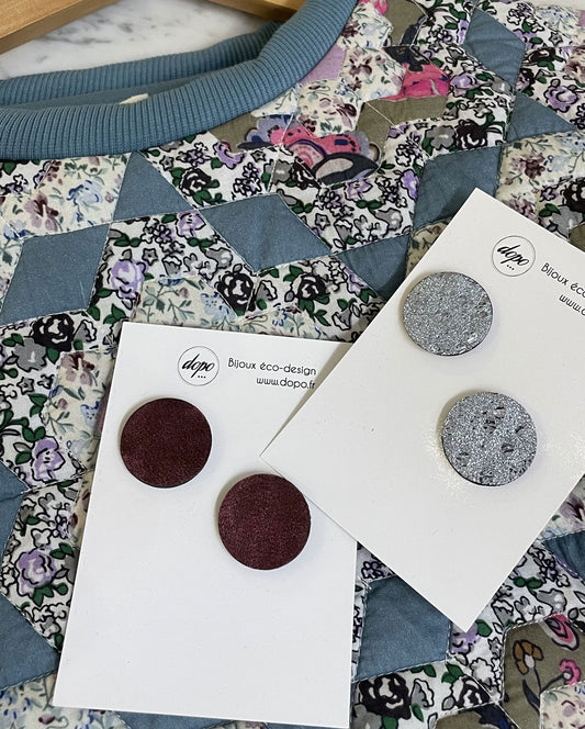 Boucles d'oreille puces de cuir bordeaux prune / Monique