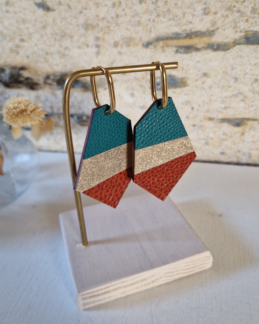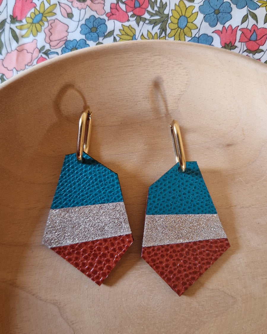 Cette paire est composée de cuir vert forêt, d’un cuir doré pailletés sombre et d’un beau rouille matiéré. De jolis tons automnaux.
