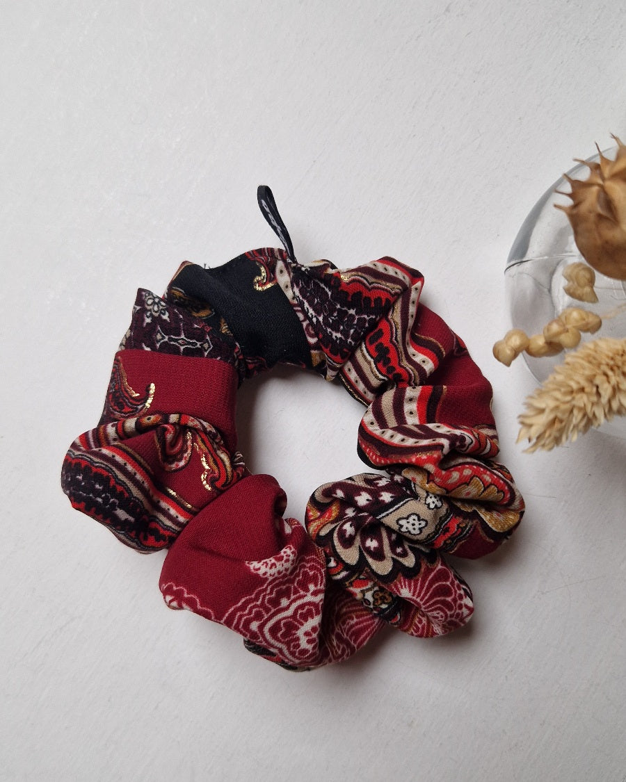 Celui-ci est réalisé à partir d'un morceau de tissu fluide bordeaux à motifs fleuris noir et touches de doré.