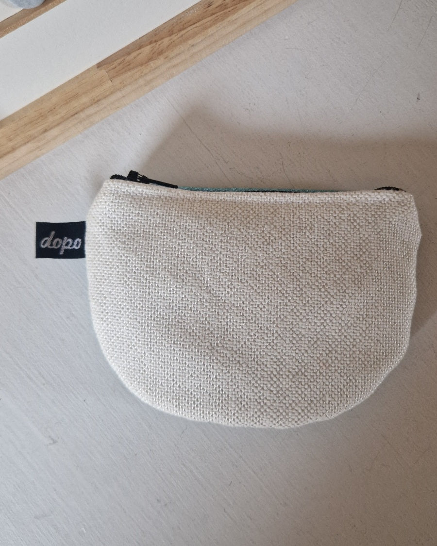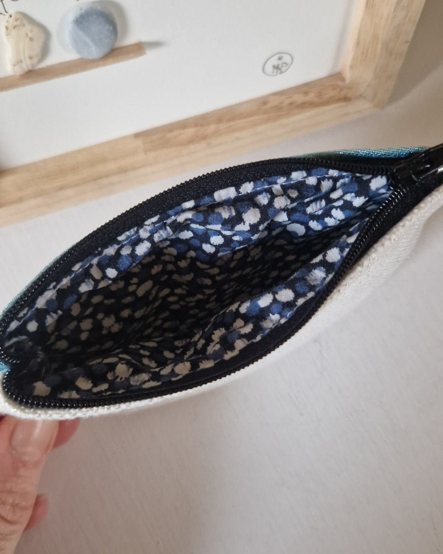 Cousu dans une chute de tissu, qui confectionnait un sac à dos, ce petit morceau de polycoton "Australie" est mis en valeur grâce à ce porte monnaie, un passepoil bleu irisé rehausse le devant. Le dos est en tissu d'ameublement upcyclé blanc nacré.