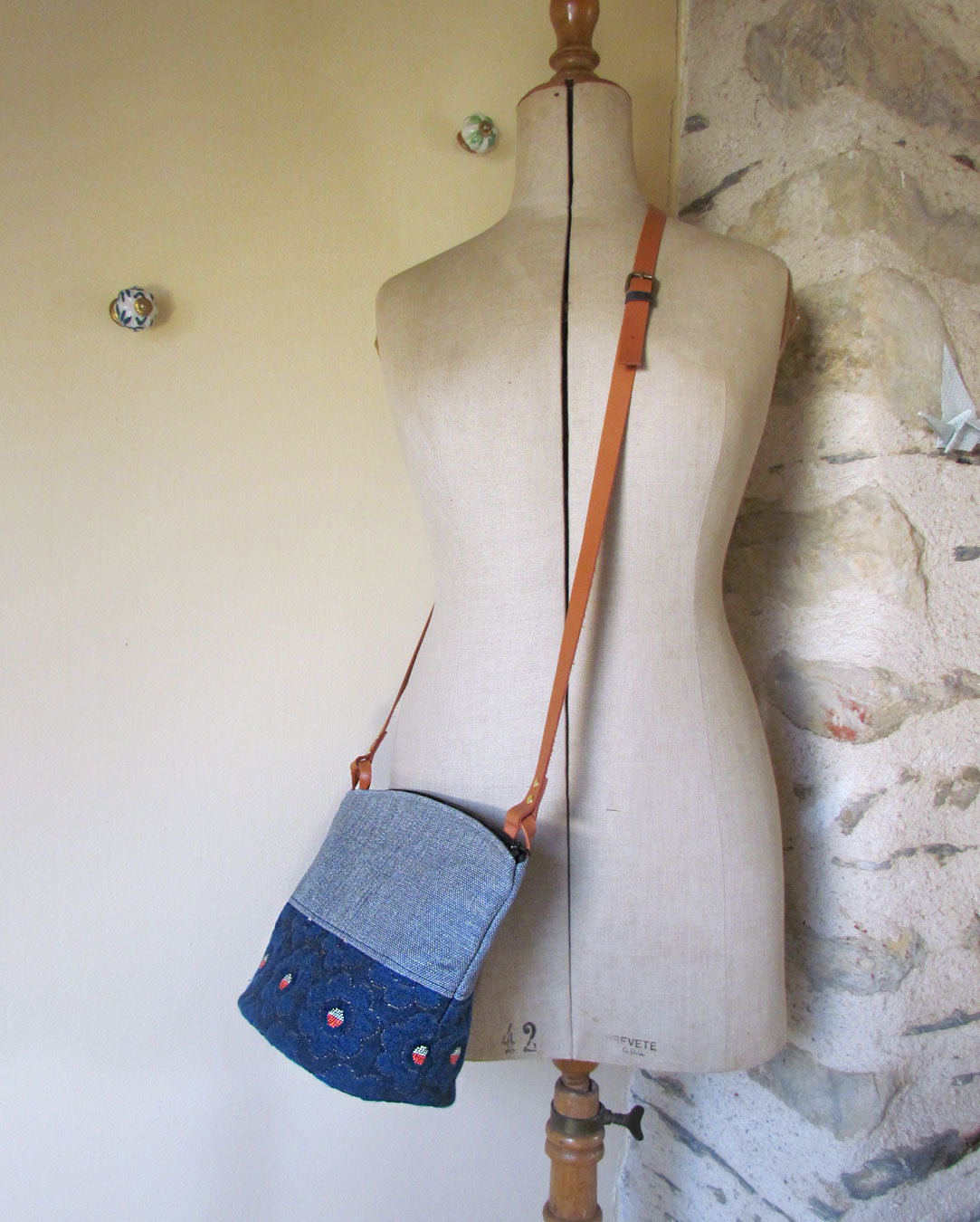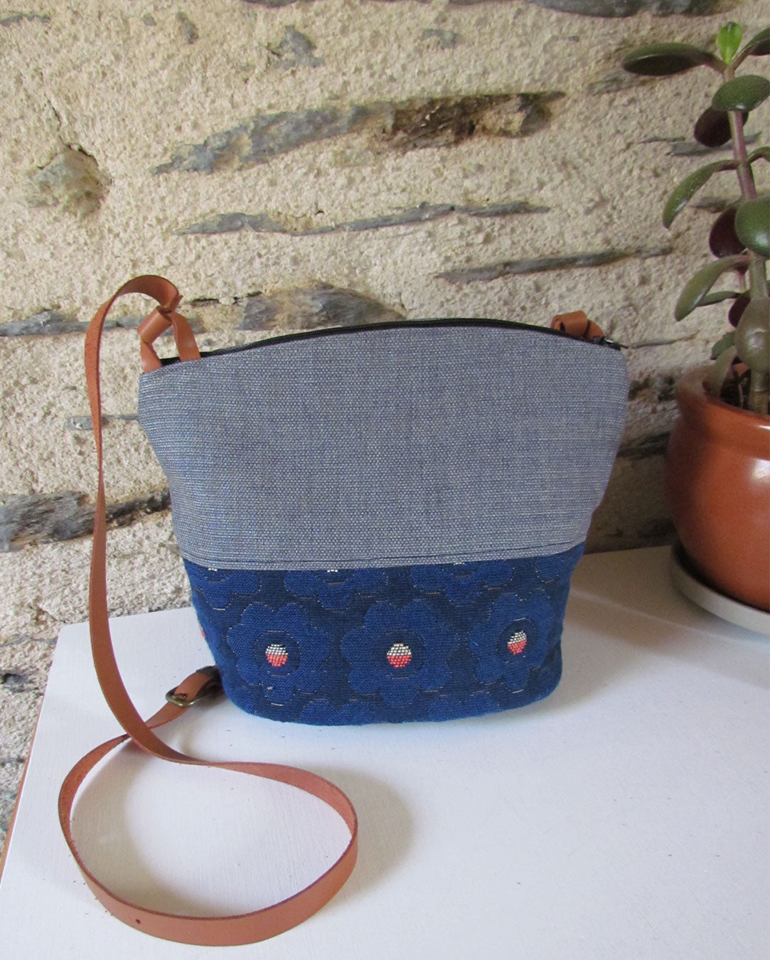 Ce sac est composé d'un tissu brillant bleu fabriqué à côté de l'atelier aux toiles de Mayenne et d'un beau jacquard à grosses fleurs bleu.